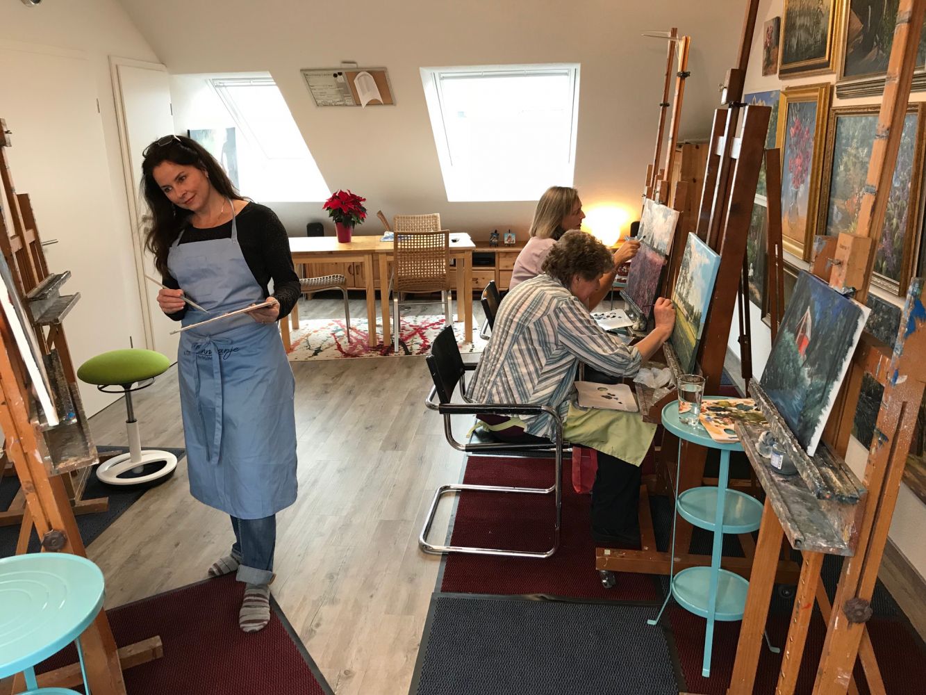 Die Malschule bietet regelmäßig Abendkurse (18–20 Uhr) und Vormittagskurse (10–12 Uhr) in kleinen Gruppen an. Zusätzlich gibt es Wochenend-Workshops und Freilichtmalerei-Termine in den Sommermonaten. Aktuelle Termine finden Sie immer auf der Startseite.
