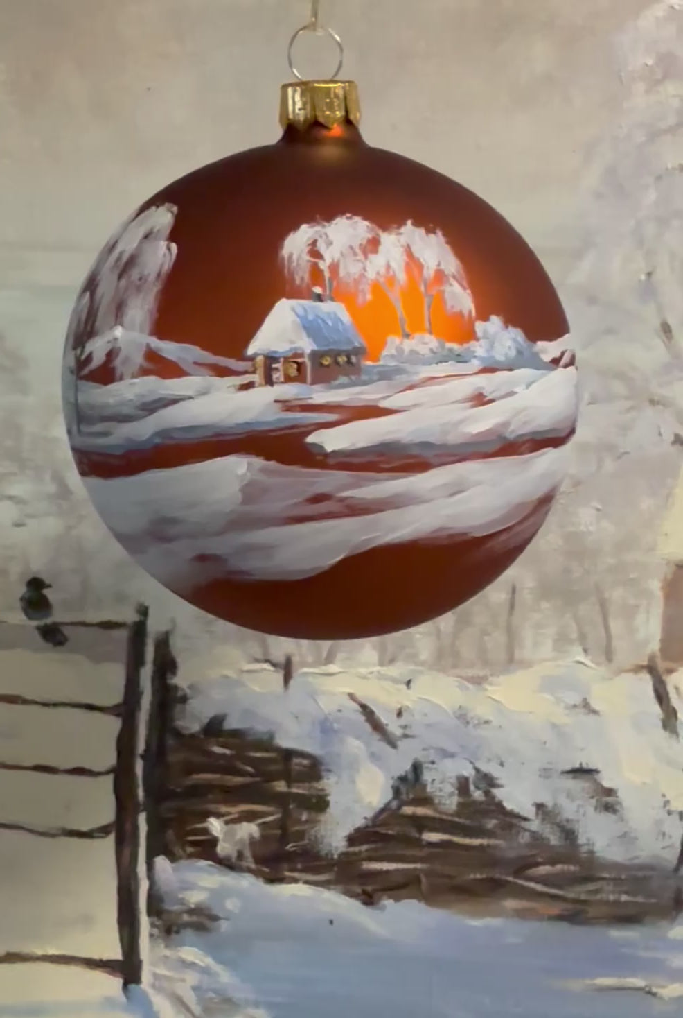 Handbemalte Tannenbaumkugel – Berghütte und eingeschneites Dorf (Unikat, Glas, Bronze)