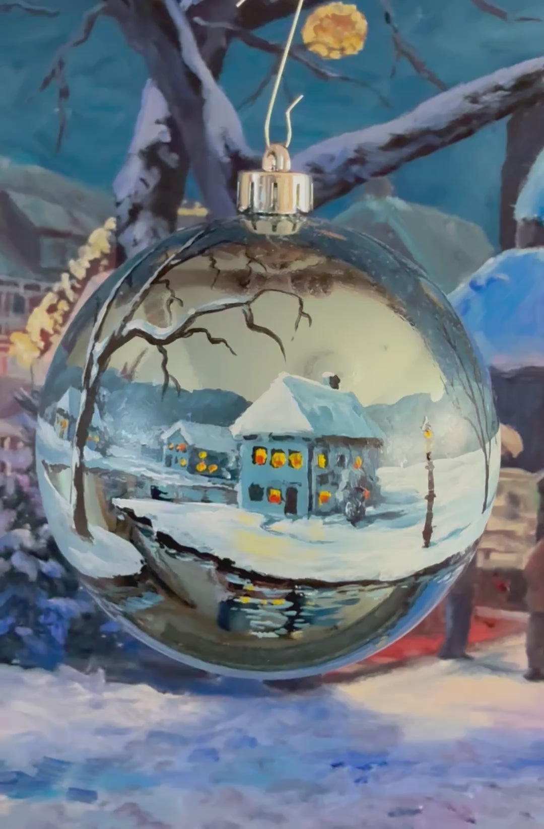 Handbemalte Tannenbaumkugel - Haus am Fluss in Schneelandschaft, Silber (Unikat, Kunststoff)