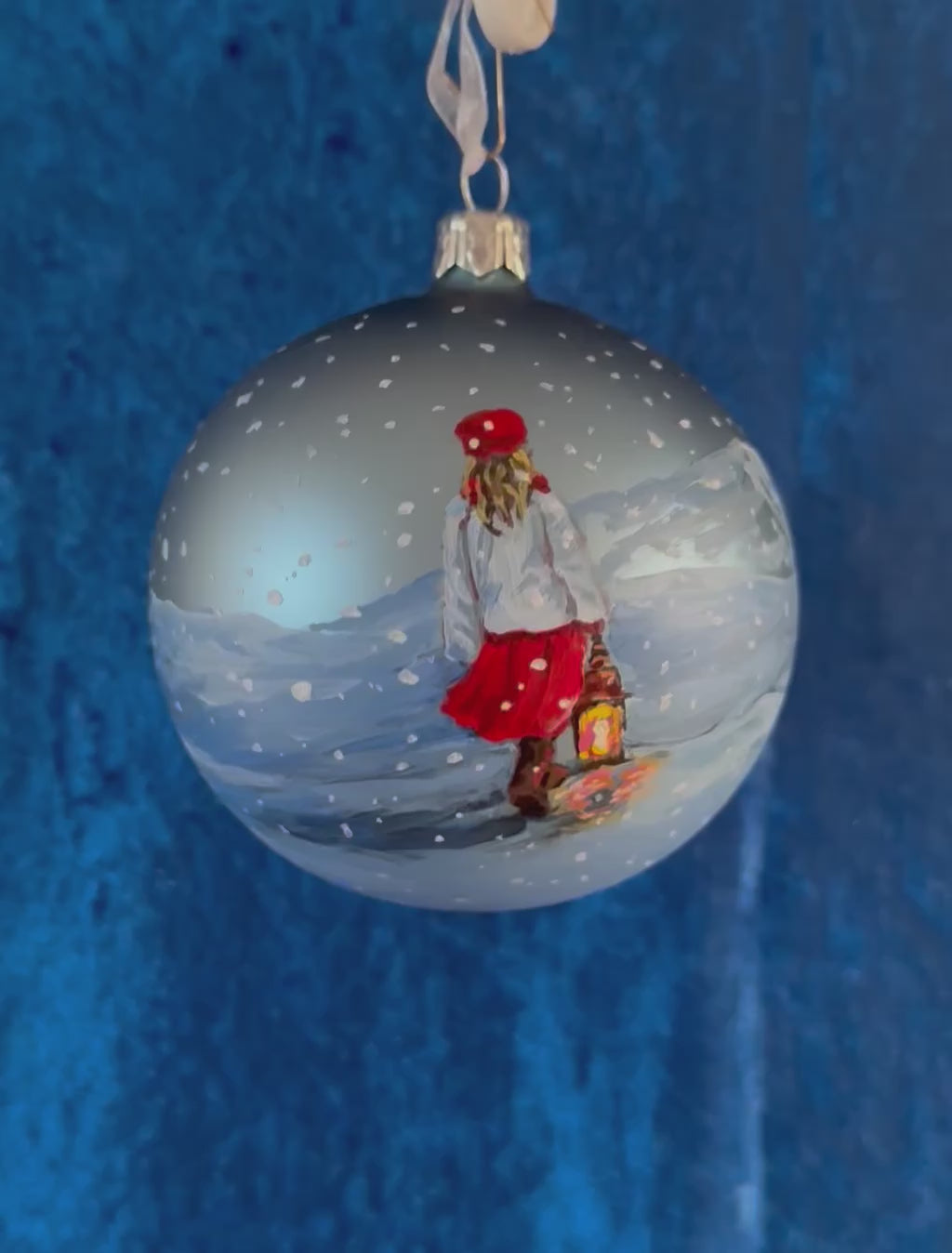 Exklusive Weihnachtskugel „Mädchen mit Laterne“ – Handbemaltes Unikat aus matt-silberblauem Glas