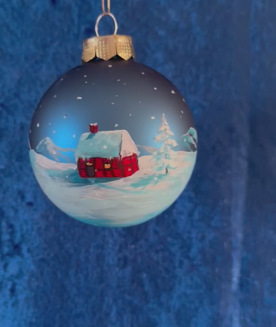 Exklusive Weihnachtskugel „Rotes Haus im Schnee“ – Handbemaltes Unikat aus mattblauem Glas