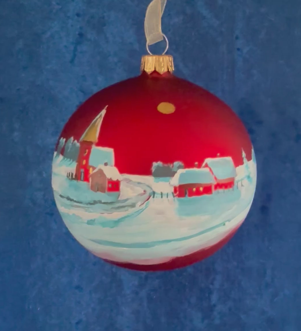 Handbemalte Tannenbaumkugel – Winterliches Bergdorf im Schnee (Unikat, Glas, Rot)