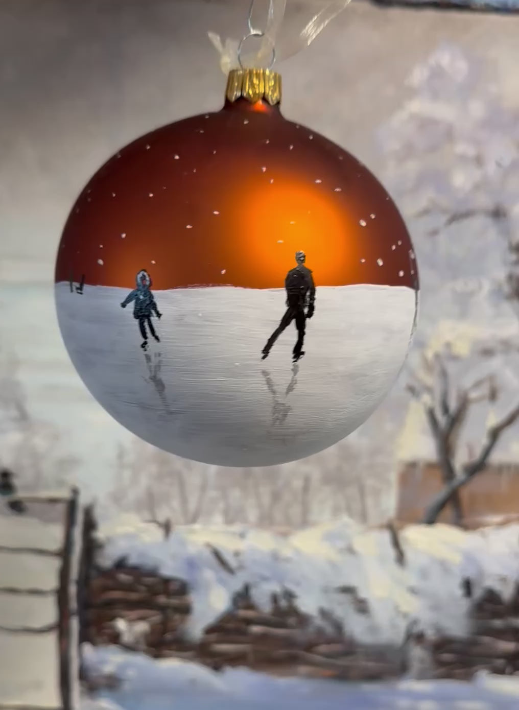 Handbemalte Weihnachtskugel aus Glas – mit Schlittschuhläufer auf kupferfarbener Kugel (Unikat)
